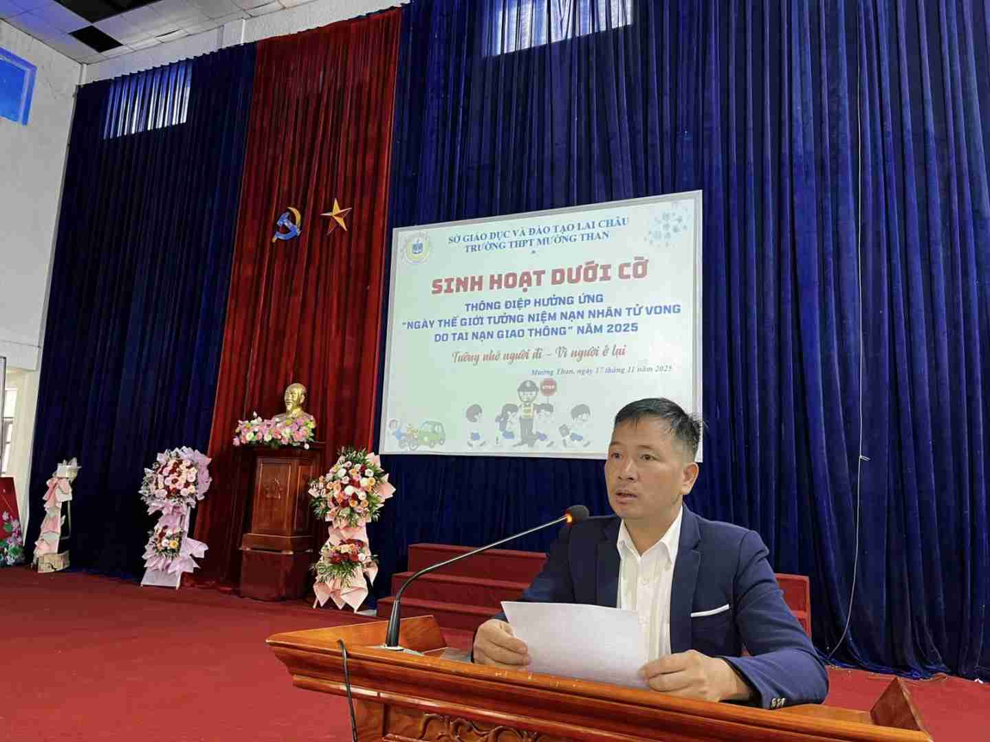 Sáng ngày 17/11/2025, thực hiện Công văn số 3913 của Sở GD&ĐT Lai Châu, Trường THPT Mường Than đã tổ chức buổi Sinh hoạt dưới cờ với chủ đề: “Thông điệp hưởng ứng Ngày Thế giới tưởng niệm nạn nhân tử vong do tai nạn giao thông năm 2025”. Chương trình diễn ra trong không khí trang nghiêm, thể hiện tinh thần sẻ chia và trách nhiệm của thầy trò đối với vấn đề an toàn giao thông.